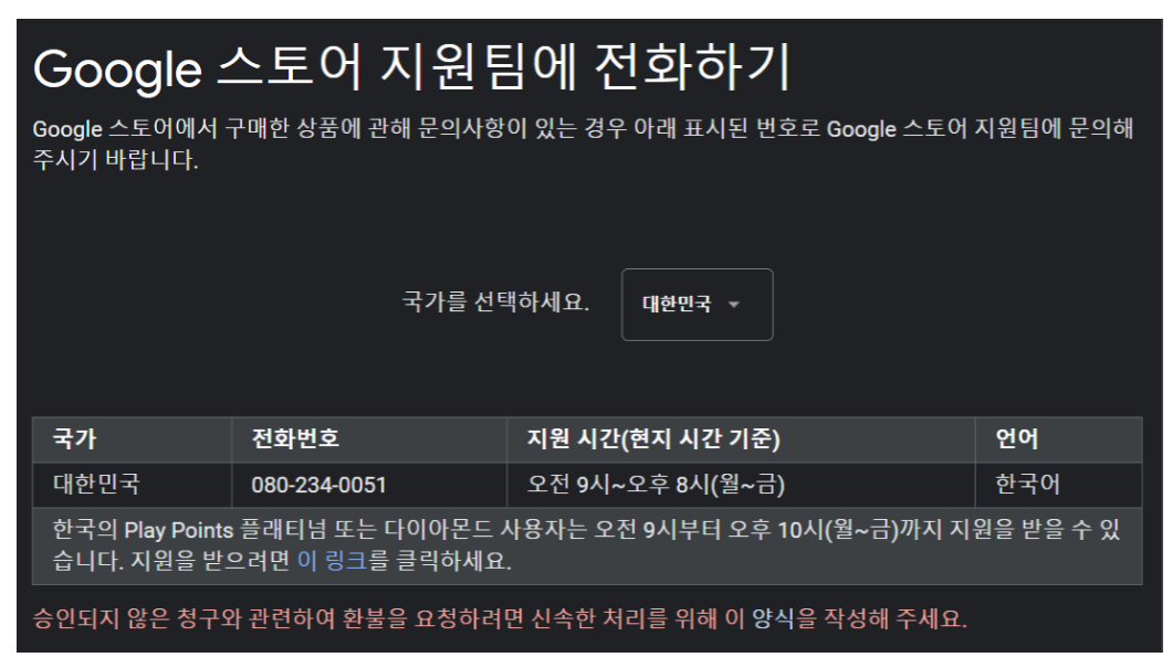 만약 위 사이트에 문제가 발생하지 않는 경우에는 위에서 제공하는 구글 플레이 스토어 전화번호를 통해서 환불을 요청을 할 수 있습니다. 다른 사이트에서 발견한 것인데 02-531-9000 번호도 연결이 가능하다고 하니 참고해 주시면 될 것 같아요.