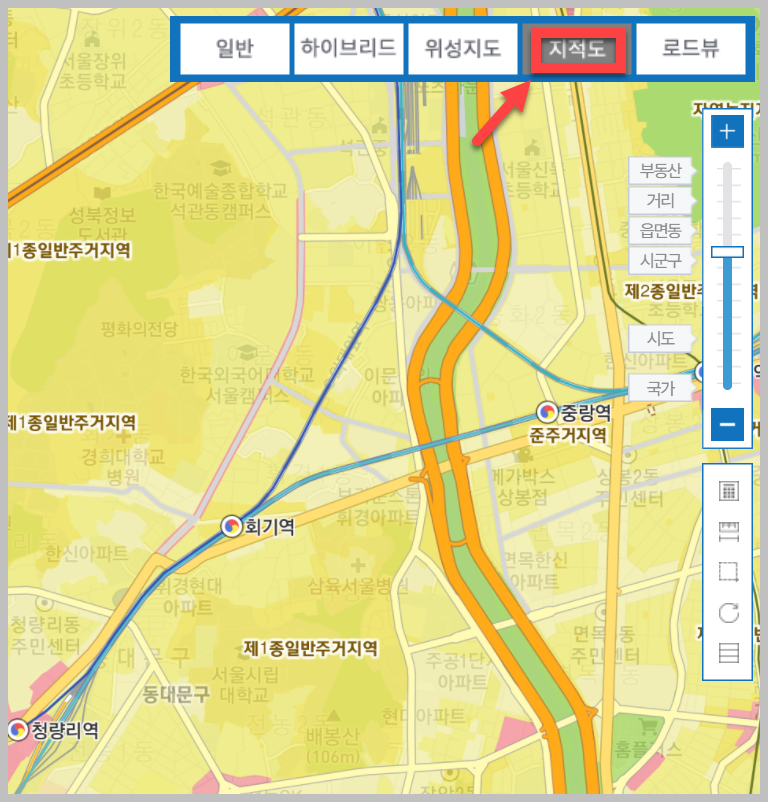 그리고 우측 상단에 '지적도'라고 되어 있는게 있는데 이것을 클릭을 하면 국토교통부에서 제공을 하는 지적도를 볼 수 있습니다.