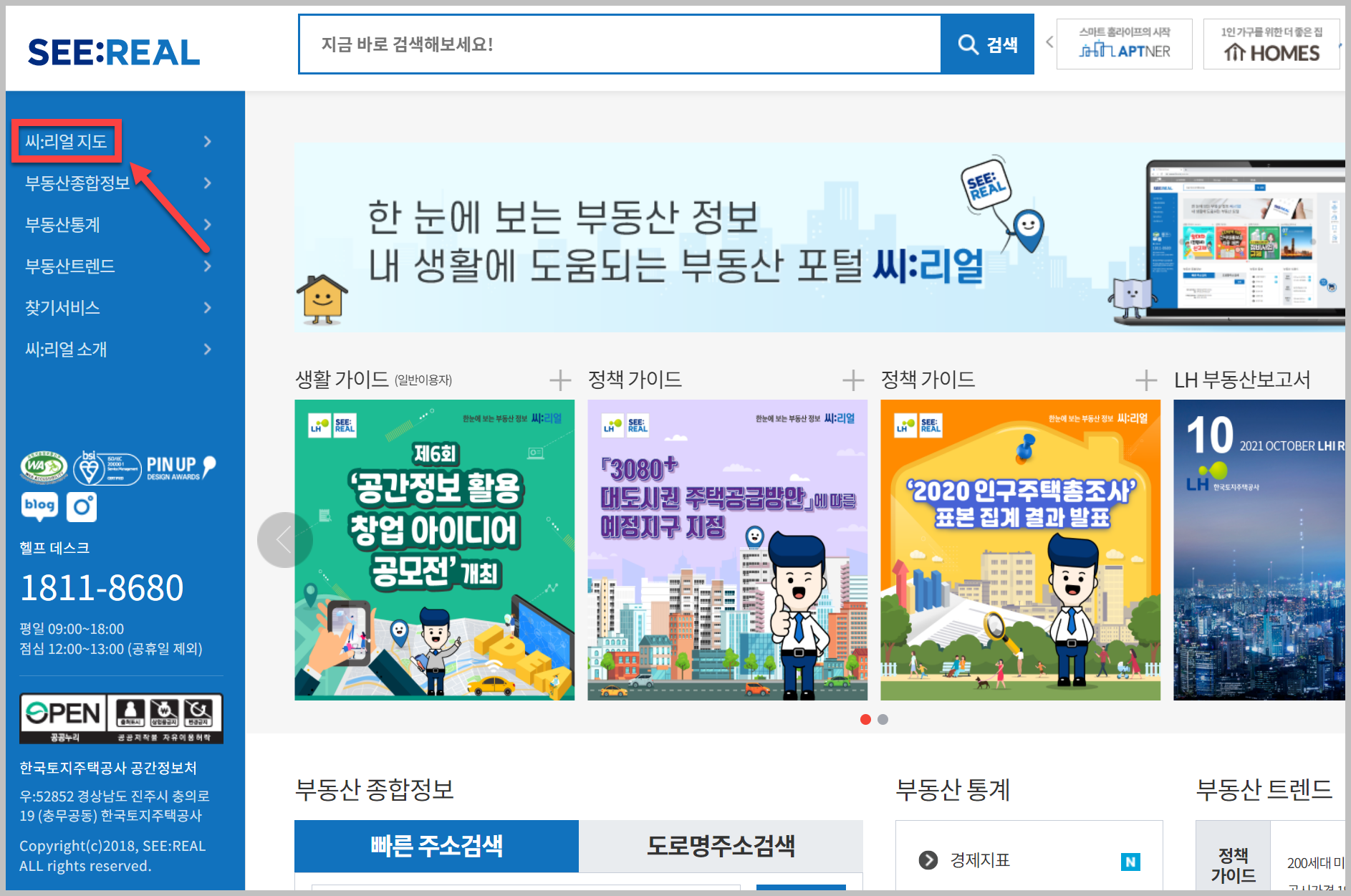 좌측 상단에 '씨리얼 지도'라고 되어 있습니다. 여기에서 LH에서 제공을 하는 다양한 지도를 볼 수 있습니다.