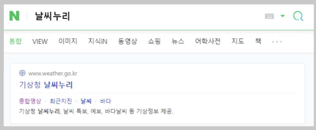 해당 사이트에 접속하기 위해서는 간단하게 검색창에서 '날씨누리'라고 검색하면 됩니다. 만약 '기상청'이라고 검색하면 특보를 볼 수 있는 페이지로 이동하는 것이 아니라 기관 자체 누리집로 이동하게 되므로 주의해야 합니다.