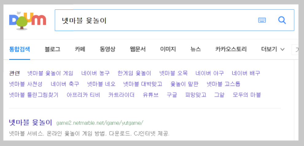 위 화면은 다음 검색에서 검색을 해 보았을 때의 결과입니다. 가장 맨 위에 윷놀이라고 되어 있습니다. 이것을 클릭하시면 홈페이지로 들어가실 수 있습니다.