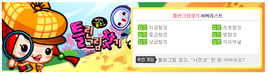 링크를 클릭하면 넷마블 틀린 그림 찾기 페이지로 바로 이동할 수 있습니다. 사이트에 들어가 보면 다른 넷마블 게임들에 비해 그래픽이나 인터페이스가 조금 덜 세련된 느낌이 있습니다. 아마도 수익성이 높지 않아서 그런 것일지도 모르겠어요.