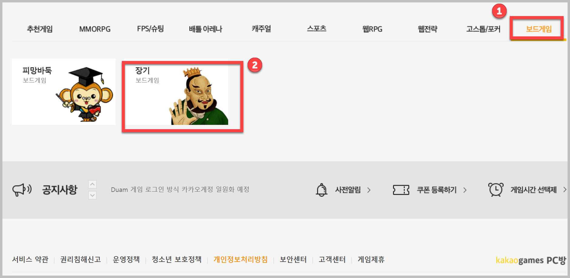 그리고 보드게임으로 들어간뒤에, 그 다음에 '장기'를 클릭을 하시면 다음장기 게임하기가 가능한 페이지로 들어가게 됩니다.