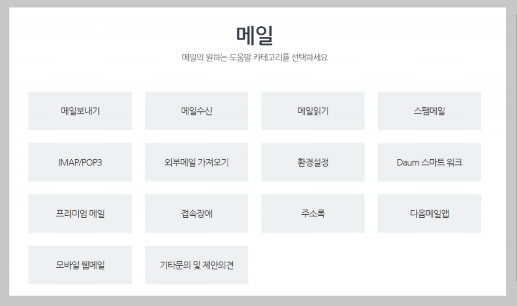 '메일'은 가장 많은 문의가 있는 부분으로 위와 같은 서브메뉴가 있습니다. 여기에서 자신의 문제와 관련된 항목을 선택하면 됩니다.
