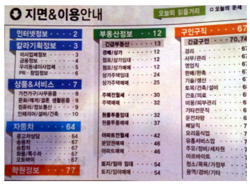 과거에는 인터넷이 없는 시절에는 생활정보지의 위상이 대단했습니다. 하지만 이제는 스마트폰 때문인지 생활정보지의 위상이 예전만 못합니다. 구인구직과 관련된 정보는 대형 포털사이트로 이동을 한지 오래입니다. 이제는 부동산과 중고차 위주의 정보가 모여 있는 것 같습니다.