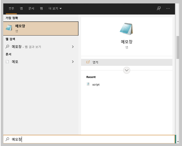 또는 'notepad'라고 검색해도 나옵니다. 어떤 방법을 사용해도 사용할 수 있습니다.