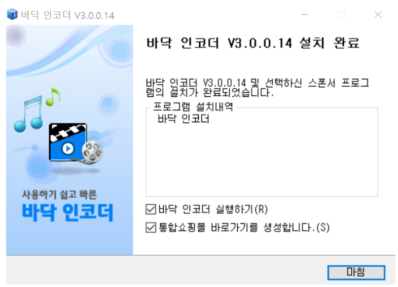 잠시 후 완료되면 다음과 같은 화면이 나타납니다. 여기에 함정이 있는데, '통합 쇼핑몰 바로가기'를 설치하게 됩니다. 무료에는 함정이 많습니다.