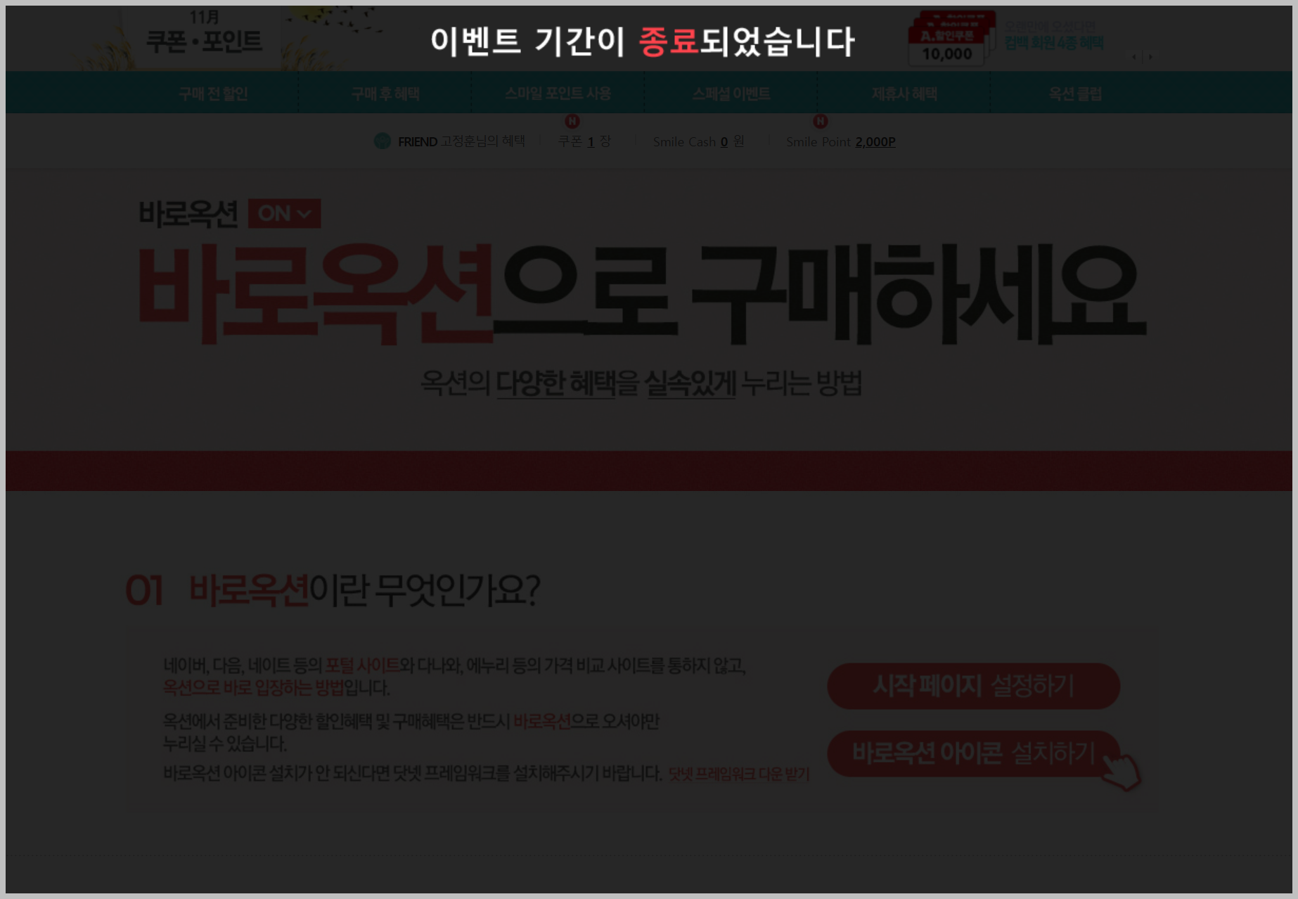 바로옥션 이벤트 페이지로 들어가시면 위와 같이 더이상 이벤트 기간이 종료되었다고 설명이 되고 내용을 확인하기 힘들게 만들어 두었습니다.