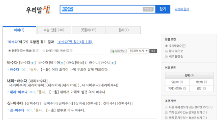 예를 들어, "바수다"를 검색해 보았습니다. 현재는 잘 사용되지 않는 말 중 하나입니다. 하지만 이러한 단어도 잘 검색되는 것을 확인할 수 있습니다.