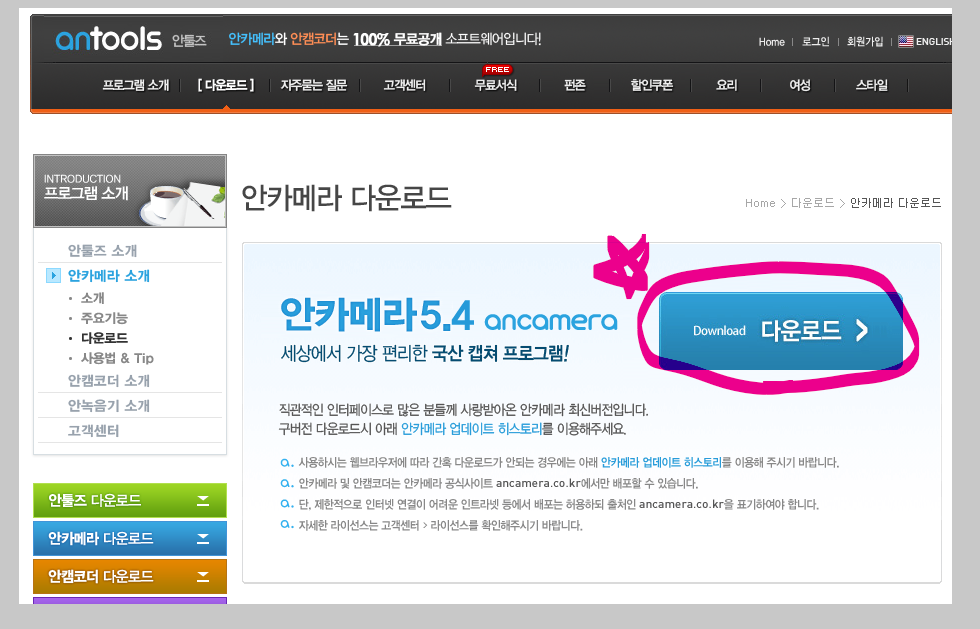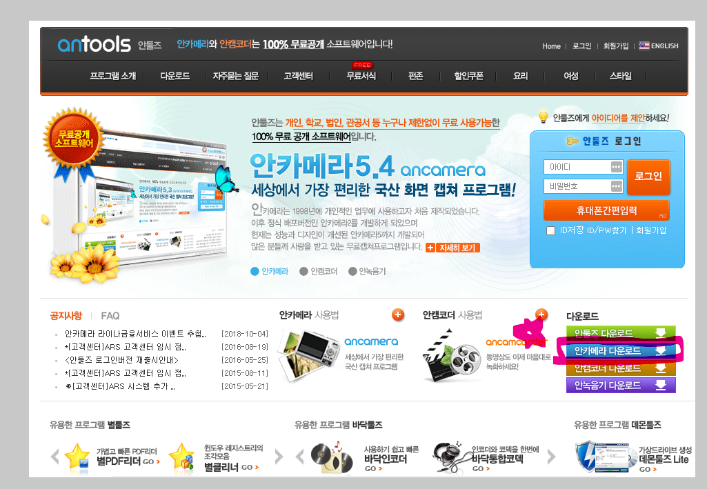 또는 위 링크를 클릭하여 앤툴즈 홈페이지에 바로 접속할 수 있습니다. 앤툴즈 접속하면 위와 같은 화면이 나타납니다. 안툴즈에서 ancamera를 받을 수 있습니다. 해당 사이트에서는 다른 무료 소프트웨어들도 만나볼 수 있습니다.