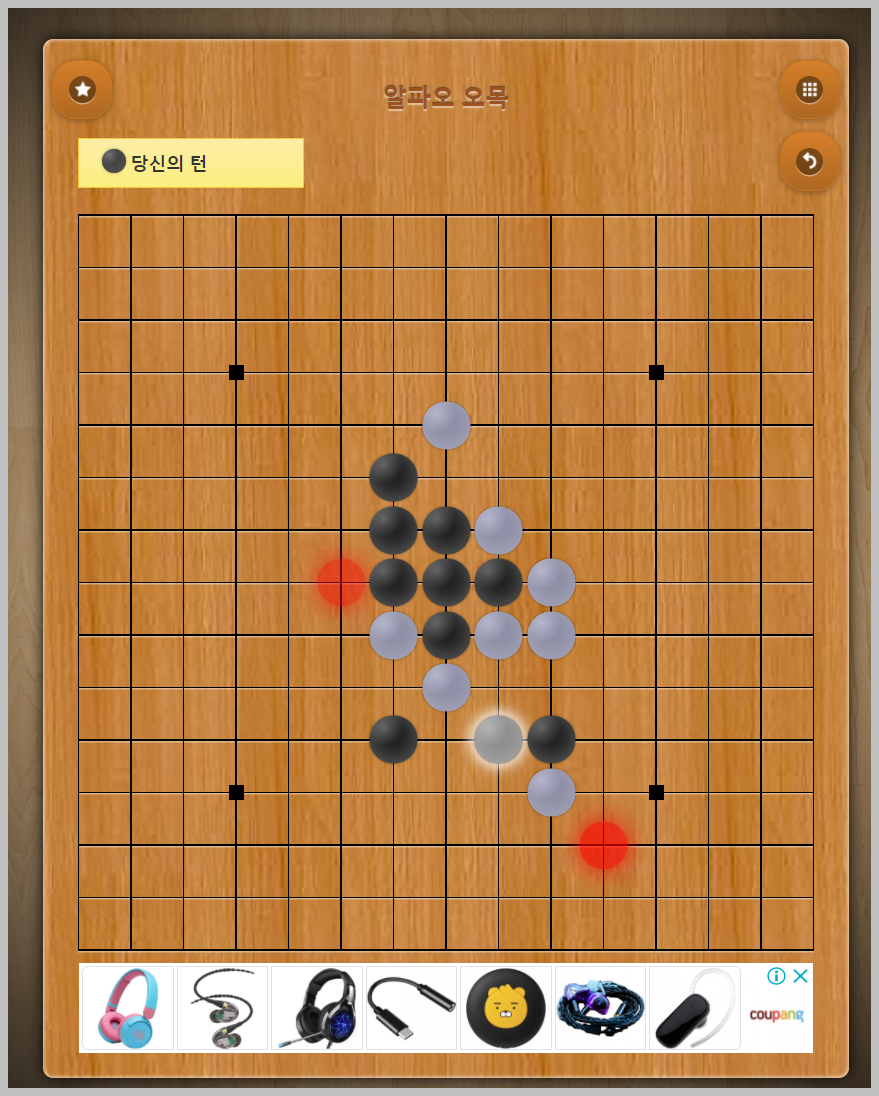 알파오 오목은 굉장히 난이도가 있는 AI를 가지고 이쓴 것은 아닙니다. 저도 이길 정도의 수준입니다. 그렇기 떄문에 시간을 떄우기에는 굉장히 훌륭한 게임입니다.