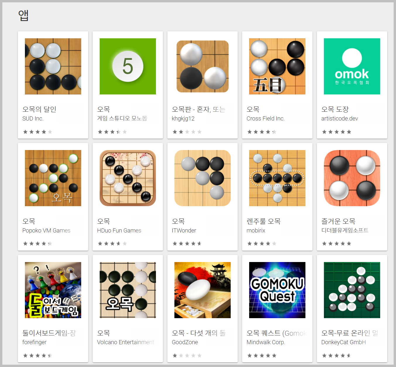 당연한 이야기지만 스마트폰으로도 오목게임을 할 수 있습니다. 구글 플레이 스토어나, 애플 앱스토어에서 '오목'이라고 검색을 하면 수도 없이 많은 오목게임이 나옵니다.
