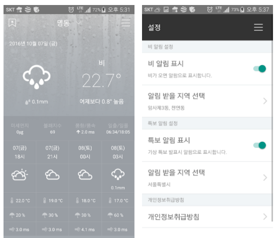 그외에 비알림, 특보알림 그리고 지진 알림이 가능합니다. 날씨와 관련된 여러가지 정보를 확인할수 있습니다.