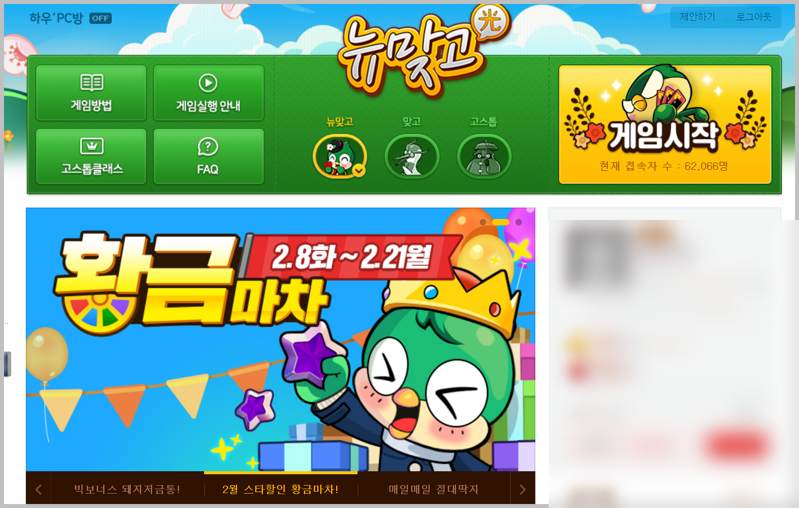 컴퓨터에서 피망뉴맞고를 하는 방법은 꽤나 다양합니다. 여러 사이트에서 채널링 서비스를 하고 있기 때문입니다. 다음 아이디가 있는 사람은 다음 채널링 서비스를 이용하시면 됩니다. 여러모로 다음 채널링 서비스가 편리하더라고요