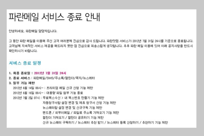 위 이미지는 아카이브를 떠논것입니다. 2012년 7월 31일 24시 부터 파란메일 서비스가 종료가 되었다고 나오네요. 이때 다음 메일로 이전을 했다면 파란메일 계정을 그대로 이용이 가능했다고 합니다. 기존에 수신한 메일도 다음 메일에서 확인이 가능했었습니다.
