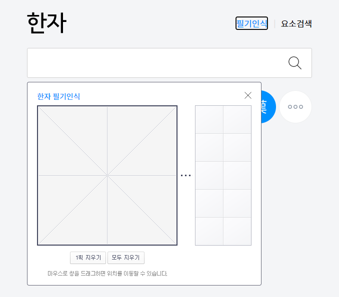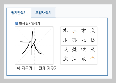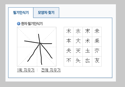 다음 한자검색기 역시 네이버 한자검색기와 비슷한 구성을 가지고 있습니다. 필기인식과 요소검색이라는 기능이 있습니다. 인식률도 나쁘지 않습니다.
