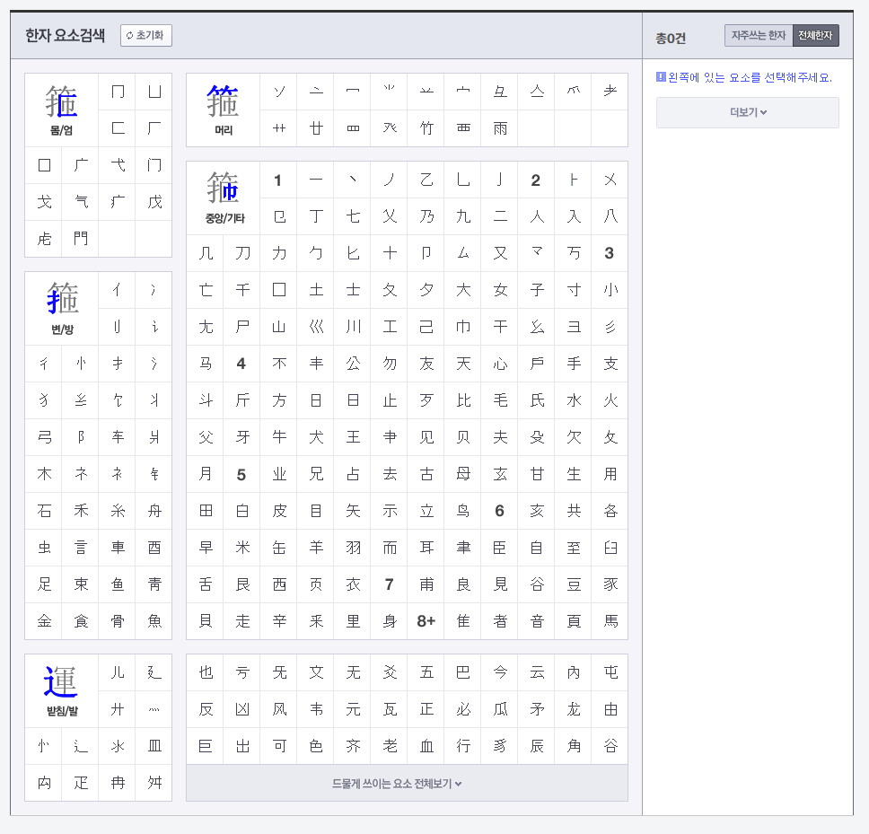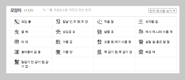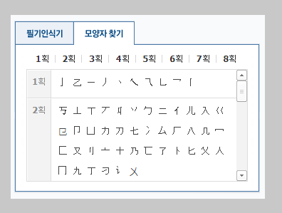 모양자 찾기는 옥편이라고 보시면 됩니다. 옥편의 부수를 찾고, 그리고 획수를 계산을 해서 원하는 한자를 검색을 하시면 됩니다. 이러한 방식은 획수가 많은 한자의 경우에 괜찮은 방법입니다.